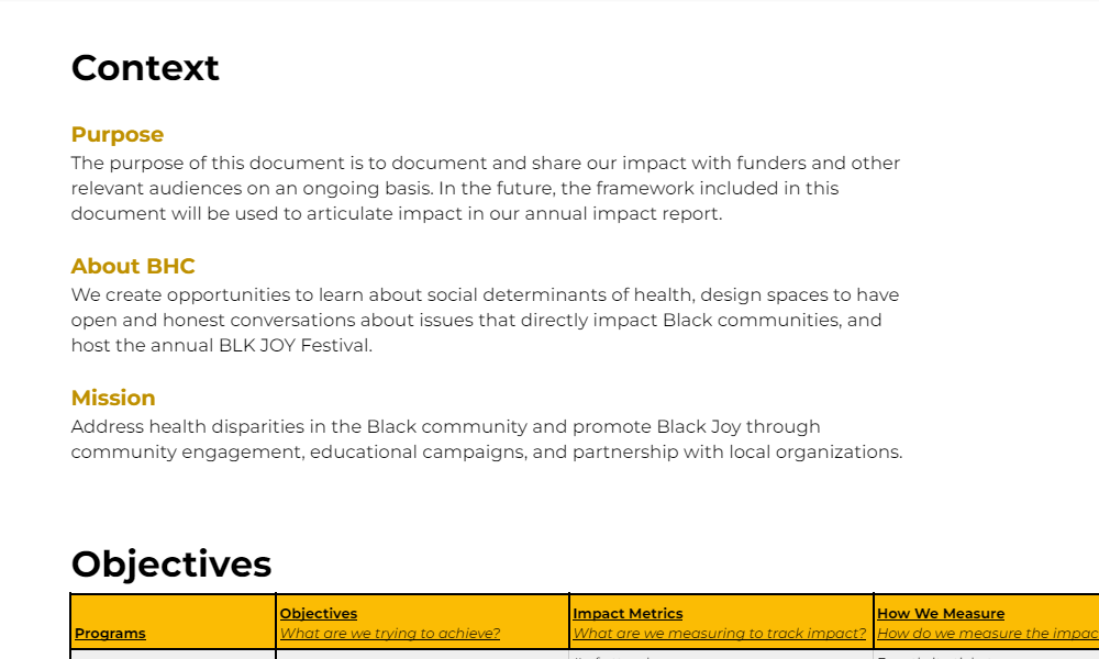 Referencing an OKR (Objectives and Key Results) framework, I drafted an Impact Report Template outlining the mission, programs, and impact metrics for the Black health Commission. The template would be used to share impact updates with funders on an as-needed basis.